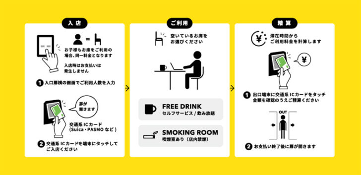 Suicaなど交通系電子マネー専用精算システムを出入口に設け、滞在時間に応じて課金する「時間課金制システム」を導入したカフェを出店するもの。営業時間は7時~21時で、料金は20分200円で、1分超過ごとに10円(税込)課金となる。