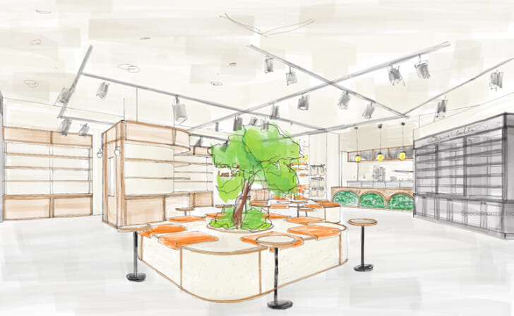 店内中央にはシンボルとなる大きなベンチシートを設置し、ゆったりとした空間の中で「チョコレート」「カフェ」「ビューティアイテム」の3つのカテゴリーで、さまざまなカカオの世界を家族で楽しめる、「カカオ・ライフスタイル・ストア」を提案する。