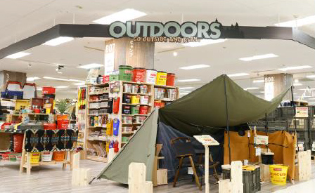 アウトドアゾーンは1階・2階に売場面積約820m2で展開する。1階ではサイクル用品、2階ではカー用品のほか、季節に合わせた旬なアイテムを幅広く揃えた。アウトドア用品売場では、人気の本格バーベキュー用品やキャンプ小物も多数取り扱い、実際に見て触れる見本品を数多く展示している。