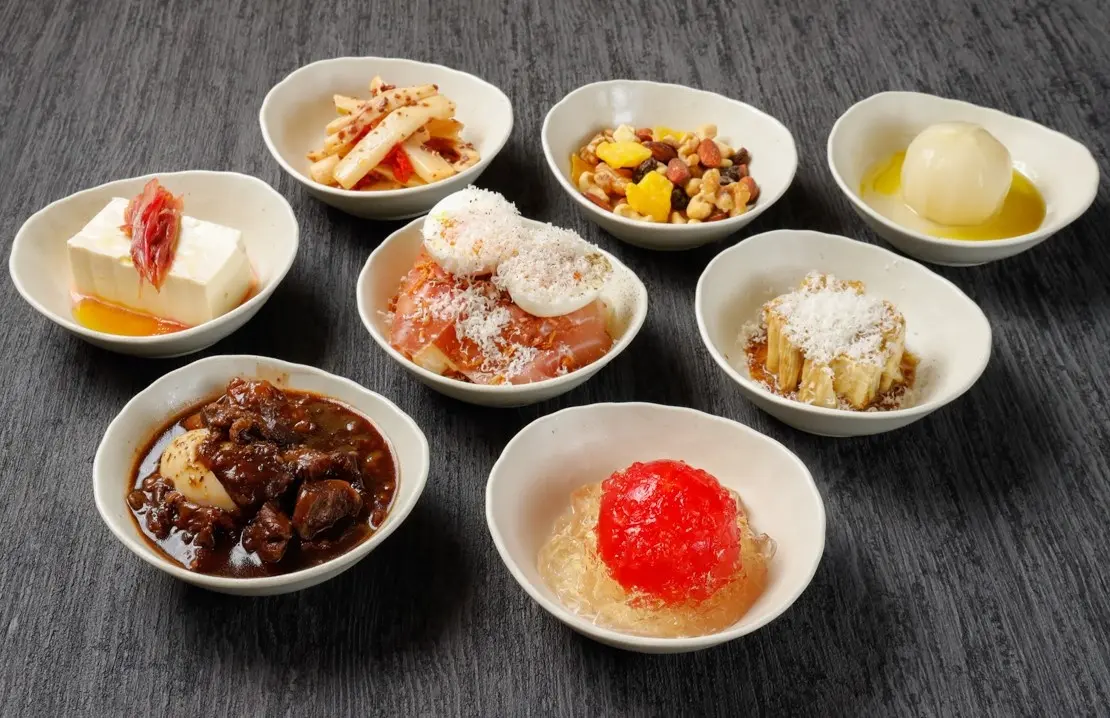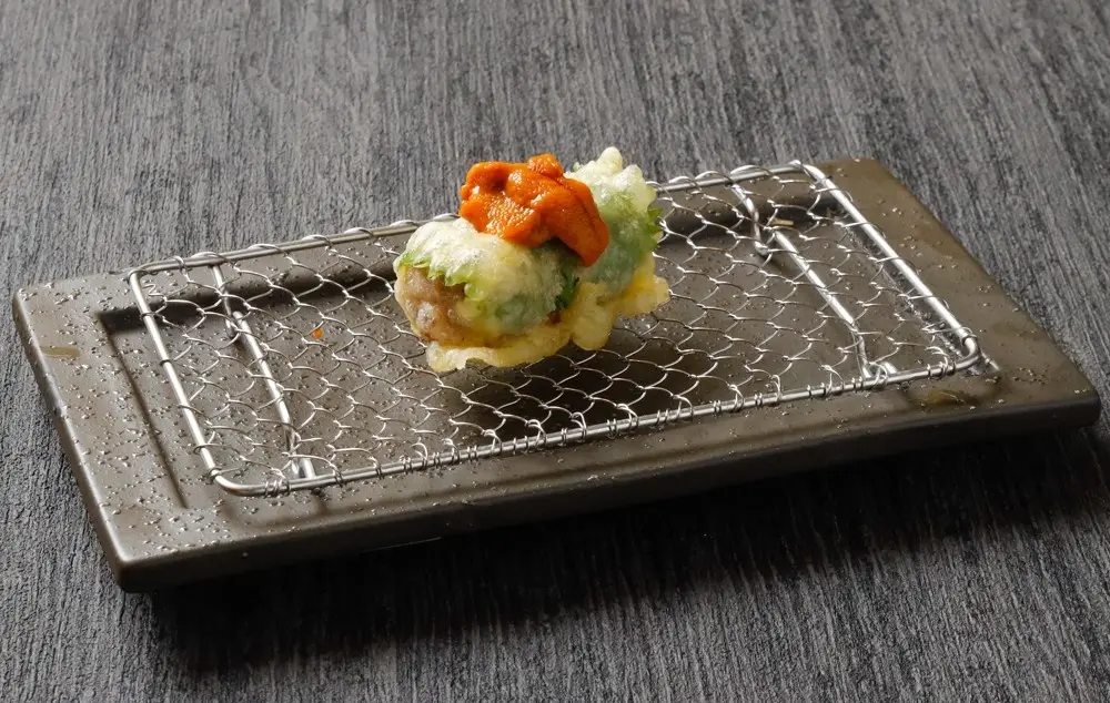 「U・NI・KU~和牛×大葉×ウニ~」(税込999円)、「白子の天ぷら~バターしょうゆ餡&トリュフかけ~」(1280円)、「厚切りサーモン&たっぷりイクラ」(999円)などのオリジナルメニューをラインアップする。おつまみに最適な小鉢も用意した。