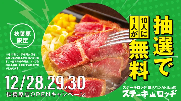 ヨドバシAkiba/8階に「ステーキロッヂ」オープン記念で10人に1人無料