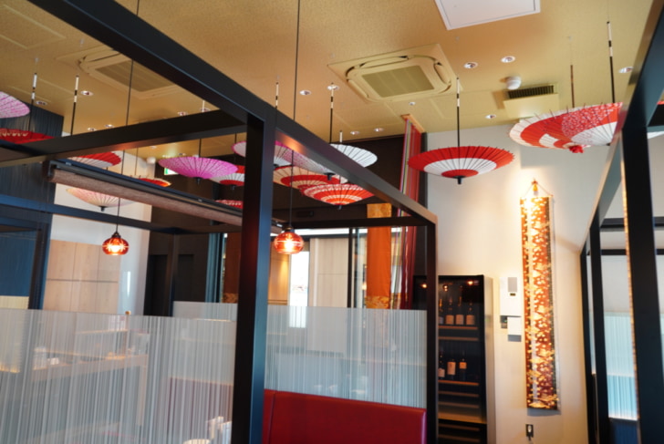 和を意識した店内で、和傘や掛け軸など日本文化を取り入れている。「和傘などの内装はこの店だけの特徴で、インバウンド需要を意識した」と藤山さん。