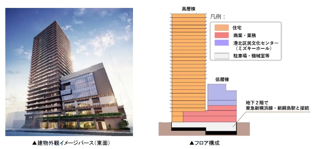 高層棟は、地上29階建て・地下1階建て、総戸数252戸の分譲タワーマンション「ドレッセタワー新綱島」と一部が商業施設となる。