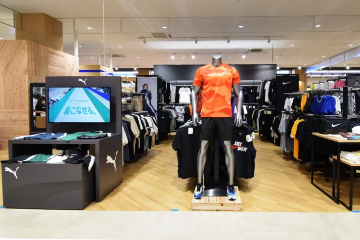 スポーツウェアはプーマ、オークリー、アディダス、ナイキなどのブランドを中心に、スポーツブランドならではの機能と動きやすさを兼ね備えた商品が並ぶ。レディスコーナーではブラトップやレギンスなどのラインアップも充実、ジュニアウェアも多数用意した。