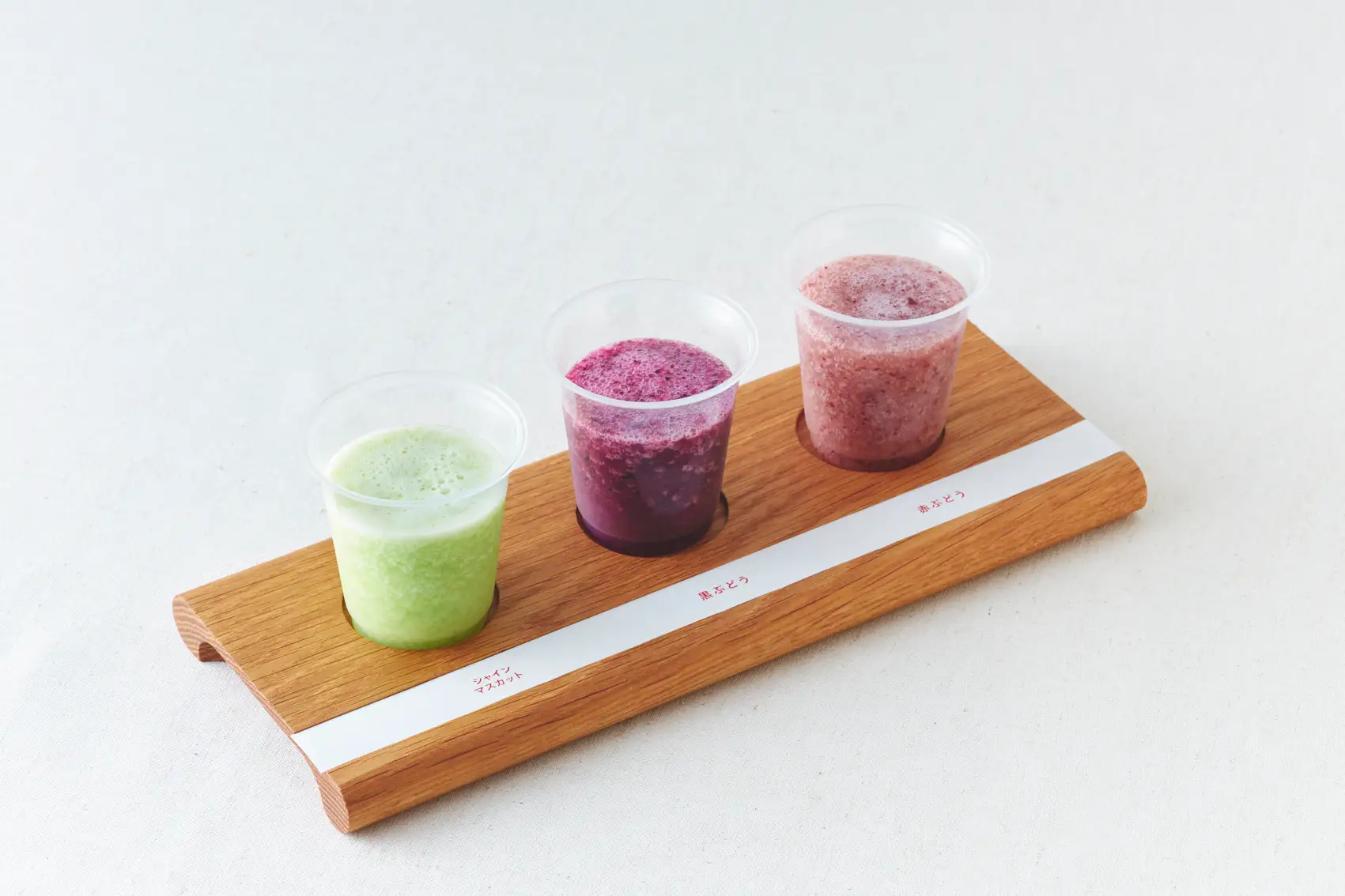 オープン時のメニューとして、ぶどうの中でも大人気の「シャインマスカット」、種無し黒ぶどうの「ナガノパープル」、甘みが強い赤ぶどう「クイーンルージュ」といった品種をラインアップした。