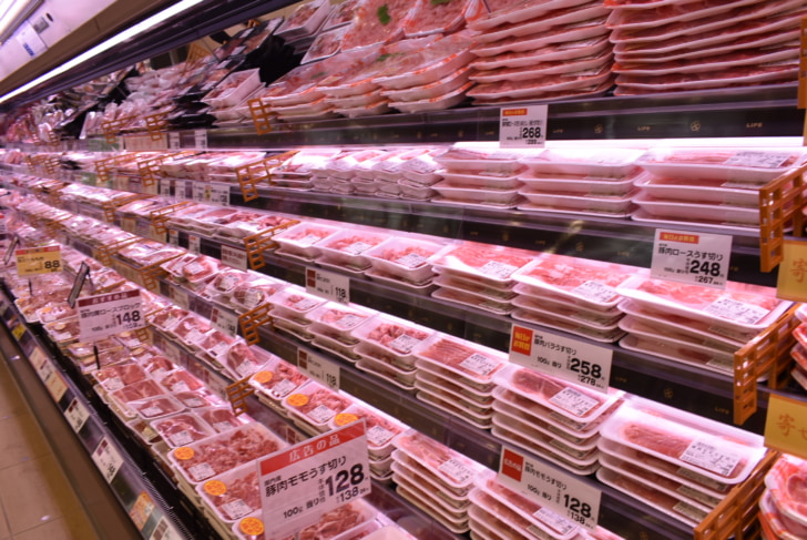 畜産コーナーでは、ベーシック品からこだわり商品までラインアップ。精肉売場では、ライフオリジナルの「あまに豚・あまに鶏」をメインに、ワンランク上の「鹿児島県産黒豚」「純和赤鶏」など豊富に取りそろえた。