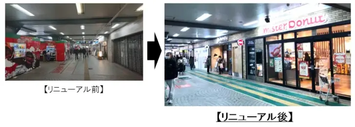 1階「バスセンターエリア」では、2023年中に4店舗刷新(ミスタードーナツは店舗リニューアル)。バスセンター側店舗ファサードの仕様を整理して駅ビルとしての統一感の構築や、東口広場側の店舗入口確保とガラス化により、開放的で賑わいのある空間の創出を図った。