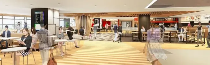 2階の北口改札前にはフードコートを新設。4月9日にオープンする。フロア面積611.5m2、座席数194席。温かみがあり居心地の良いウッド調の内装で、入口を全面ガラス張りにすることで高い視認性を確保。待合スペースとしても活用できるように、電車・バスの運行状況を表示するデジタルサイネージも設置するという(待合機能は2月28日に実装予定)。