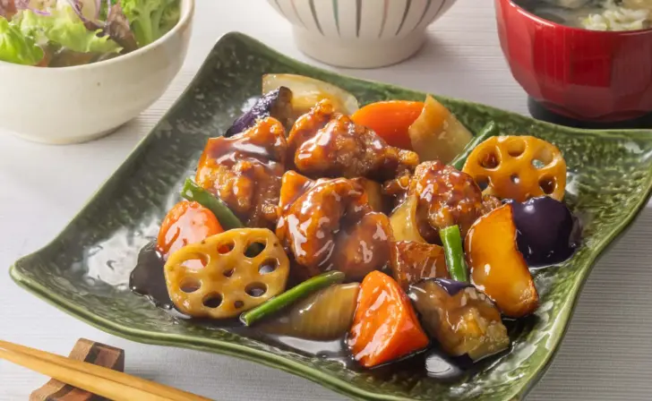 メニューのうち、「鶏と野菜の黒酢あん」(定食税込980円/単品890円)は、不動の人気No.1メニュー。大きな野菜と肉に、大戸屋オリジナルの黒酢あんを絡めた。黒酢あんは、玄米黒酢と黒糖に、りんご酢で味を調えている。