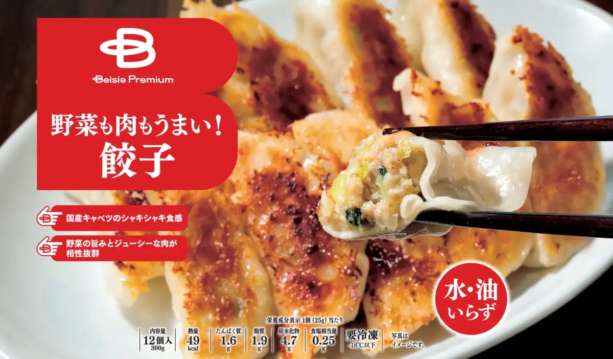このほか、ベイシアが自信をもっておすすめするプライベートブランド「Beisia Premium」では、6月に発売したばかりの「野菜も肉もうまい!餃子」(税別179円)や「おいしいシュークリーム(カスタード&ホイップ)」(139円)なども取り扱う。