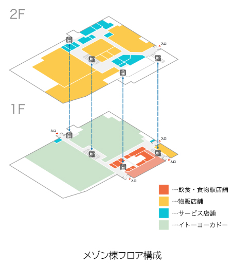 既存建物をリニューアルした「メゾン棟」、これまでの独立立体駐車場を解体し新規商業施設を建設する「テラス棟」で構成される。エリアにはない大型物販、クリニックモールをはじめとした生活サポート機能の一大ゾーンを形成する。2棟合わせて43店舗がオープンする。
