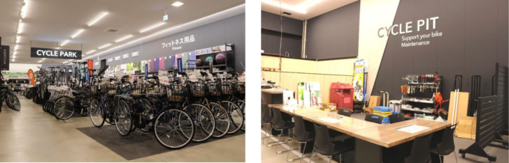古河市は、県内では比較的平坦な地形特性で、買物や通勤・通学などでの自転車利用が盛んなエリアでもある。自転車の使用目的や頻度、運転時間や走行距離など、さまざまな視点で顧客のサイクルライフに合わせたサポート・提案ができるサイクルコーナーを導入。軽快車から電動自転車まで幅広くラインアップしており、気軽に相談できるサイクルカウンターも設置している。