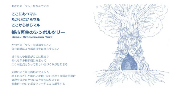まず大阪マルビルの形状を継承する。多種多様な人や用途、情報などがここに集まり、それらが絡まり合うよう、建物の構成を単一の「マル」ではなく多重に積層する「マル」で表現した。大樹のような円筒形状は、ガラスカーテンウォールで構成し、外装には大樹の枝葉をイメージした緑化ルーバーを計画。地上には大樹の木陰を感じられるよう、半屋外の屋根下空間「ピロティ」を設ける。