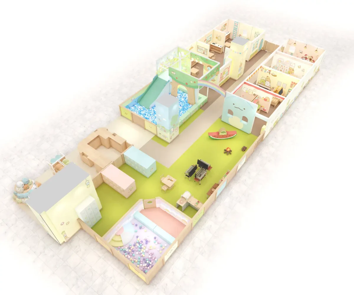 施設面積は約202m2で、現在展開中の店舗の中では最も広い。5つのエリアで構成され、このうちキャンプあそびやぬいぐるみ撮影スポット、ベビーエリアが新登場する。