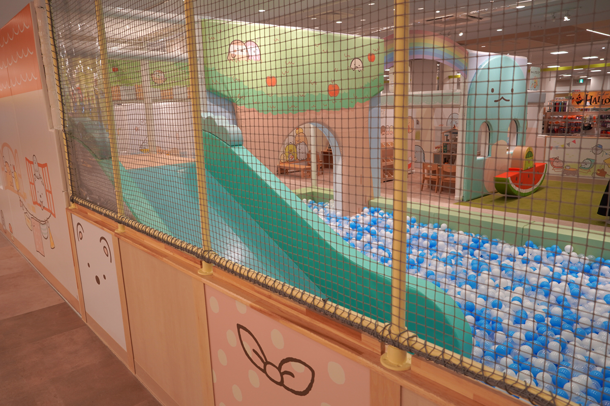 今回、すみっコぐらしの中でも人気の高いキャラクター「とかげ」をメインデザインに採用。「とかげのおかあさん」の背中を滑る滑り台や、とかげの住む森をイメージしたボールプールを設置した。