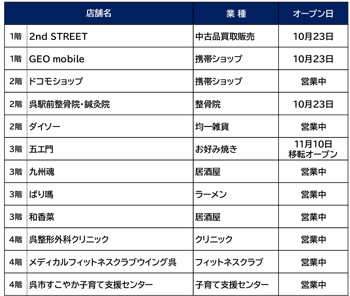 その他の専門店は、2026年の夏に向けて順次オープン。呉エリア初出店を含む店舗の導入を計画した。