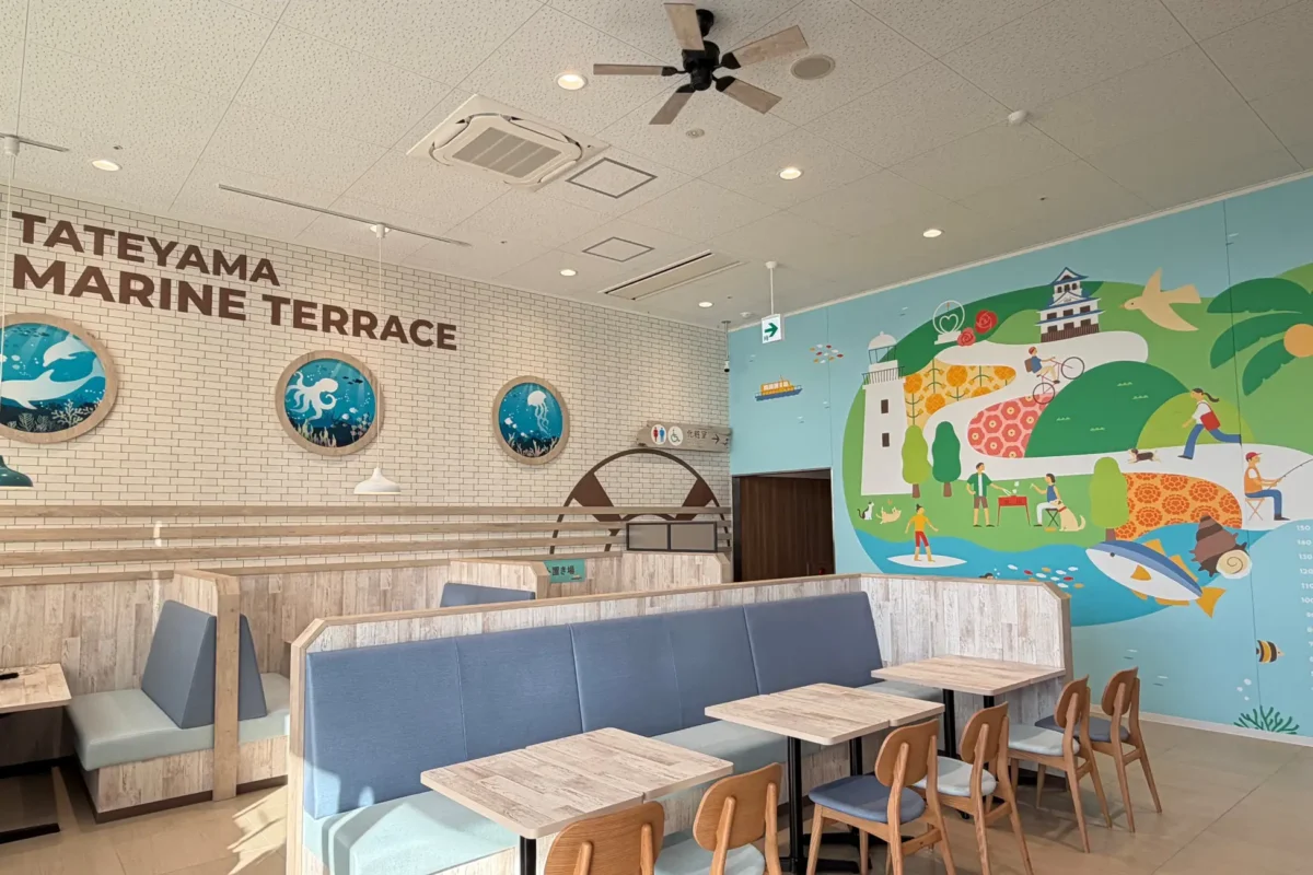 イートインスペースも設けた。「うみと、ベンチと、ひとやすみ」をテーマに、自然豊かな空間でゆったりとした時間を過ごす、やすらぎの場所を提供。誰もが心地よく過ごせるレイアウトで、地域コミュニティとのつながりを育む場を目指す。