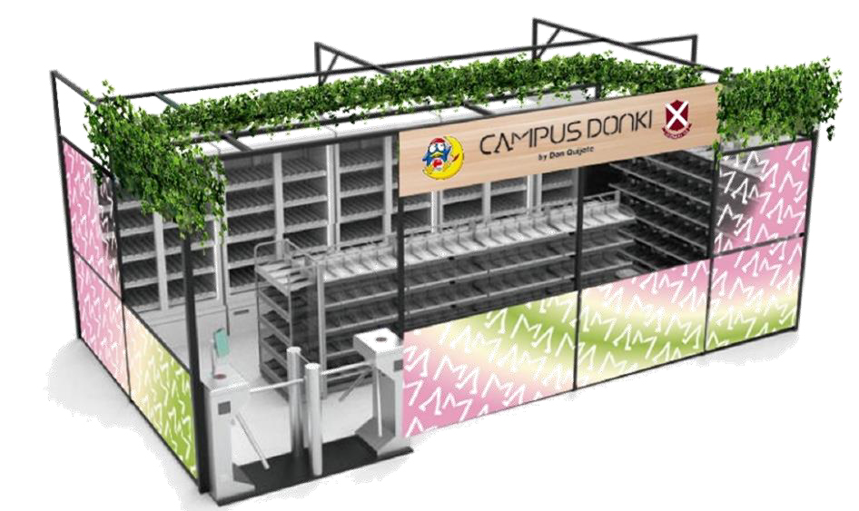 「キャンパスドンキ」は、商品を手に取り、そのまま退店するだけで自動的にキャッシュレス決済が完了する無人の小型ドン・キホーテ。省人化と自社競合しない出店をかなえる新業態として大学構内へ出店する。