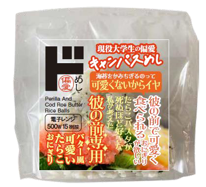 「彼の前専用 バター風可愛いたらこおにぎり」(税込171円)は、2年生のKさんによる「彼の前ではおにぎりも可愛く食べたい」という想いから生まれた商品。海苔が唇や歯にくっつくのは恥ずかしいし、そもそも噛みちぎる仕草は可愛くないから嫌という意見と、好物のたらこパスタをおにぎりにしたいという偏愛を具現化したもの。