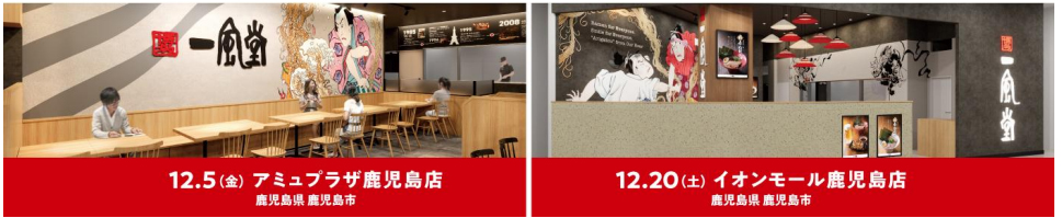 12月5日には鹿児島市中央町に「一風堂 アミュプラザ鹿児島店」を、12月20日には鹿児島市東開町に「一風堂 イオンモール鹿児島店」をそれぞれオープン。