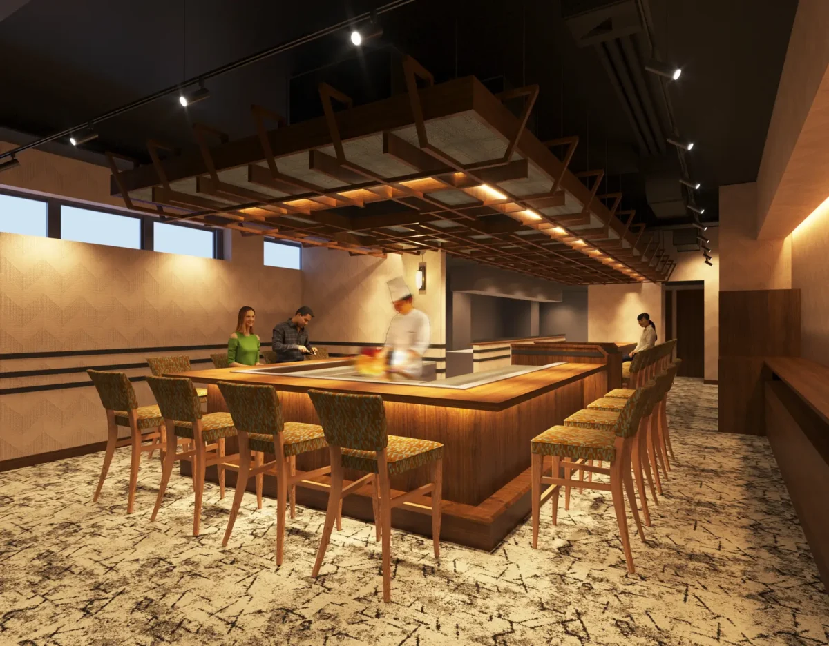 店内は、東京の都心部でありながら、整然と区画整理された「碁盤の目」の街並みと超高層ビル群をモチーフに、カウンター・個室・天井の意匠を日本建築の様式「格天井(ごうてんじょう)」になぞらえて設計した。ライブ感あふれるカウンターでは、熟練のシェフが目の前で焼き上げる臨場感とともに、こだわりの黒毛和牛を堪能できるという。