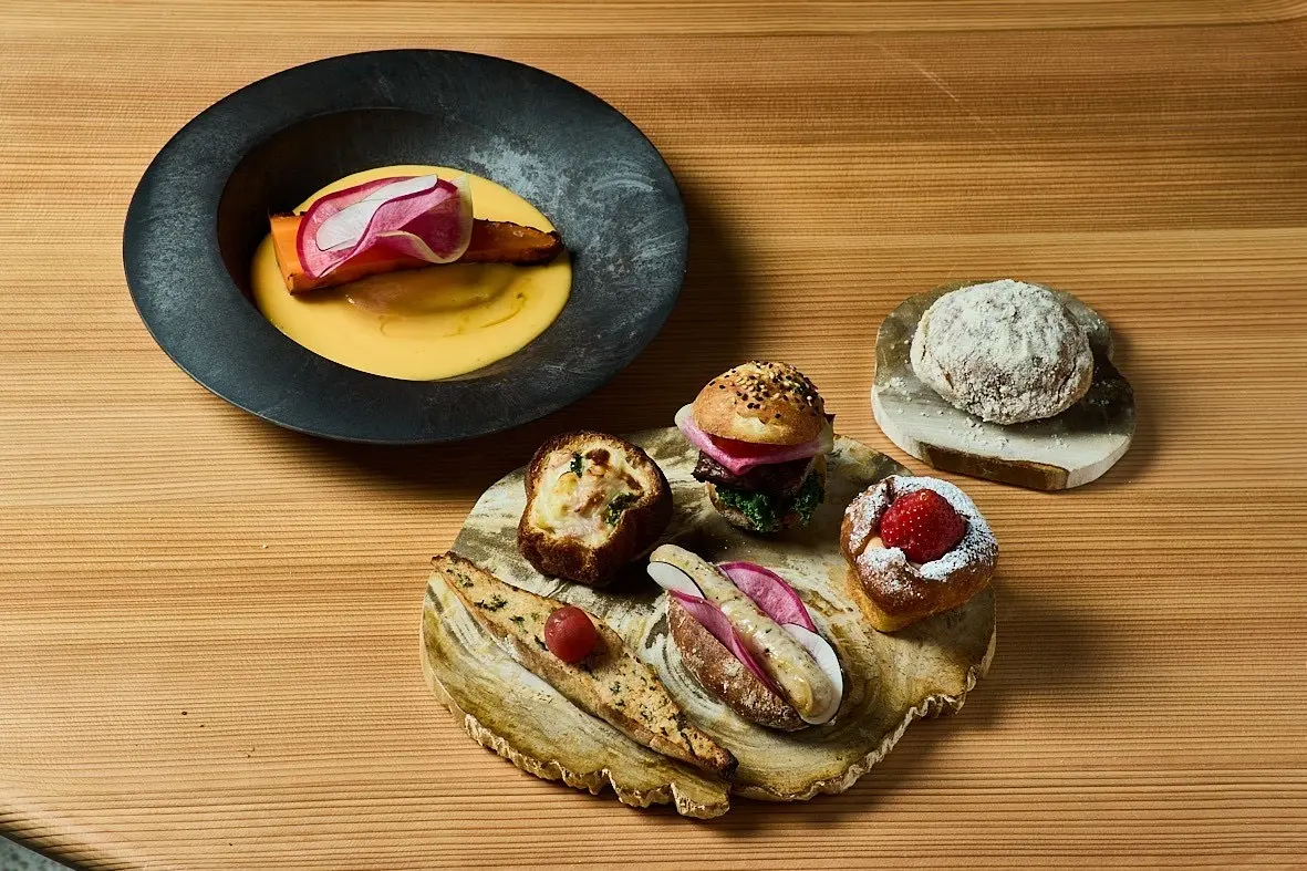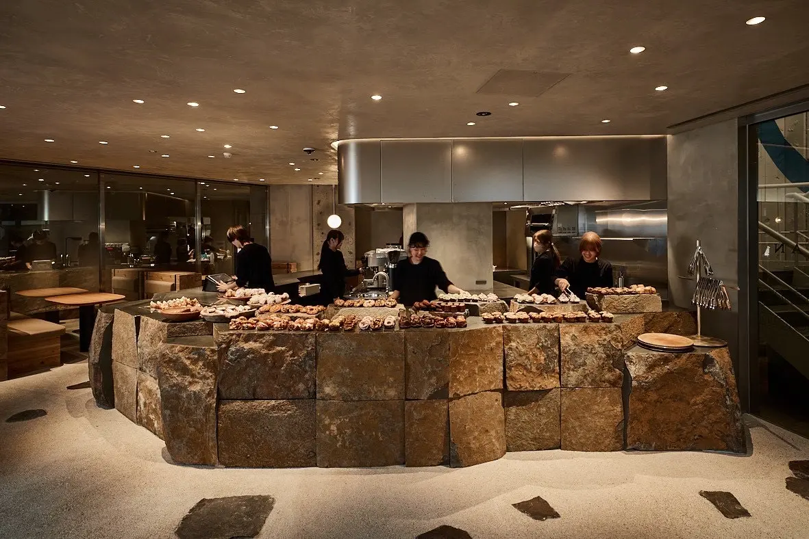 内装は「石の町にある小さなパン屋さん」をコンセプトとするアマムダコタンの世界観を引き継ぎ、石と木を組み合わせた落ち着いた空間を演出。ベンチやスツールの座面、テーブル天板には木工職人がひとつひとつ手作業で仕上げた杉材を採用した。木の温もりと手仕事が息づく贅沢な空間で、焼き菓子やパンの香りをすぐそばに感じながら、丁寧で豊かな時間を楽しめるという。