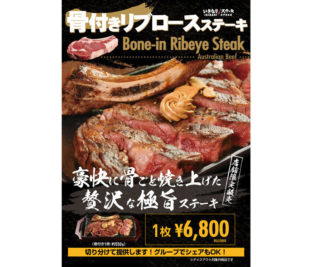 また、神田北口店オープンに合わせ、豪州産「骨付きリブロース」(1枚・約550g、税込み6800円、テイクアウト対象外)を新メニューとして販売開始する。