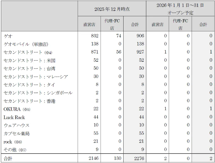 ゲオホールディングスは2026年1月、「セカンドストリート市川店」(千葉県市川市)、「OKURA国父紀念館」(台湾台北市)をオープンする。