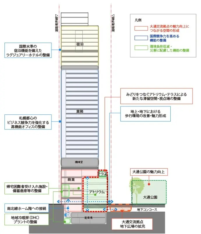サツワンは、札幌都心の駅前通と大通の交差部に位置している。商業・業務・交流機能の充実、国際水準の宿泊機能としてのラグジュアリーホテル導入、重層的な歩行者空間の整備、大通以南初のエネルギーセンターの整備や環境配慮、防災機能の強化を行うことにより、札幌都心の価値向上に寄与したい考え。