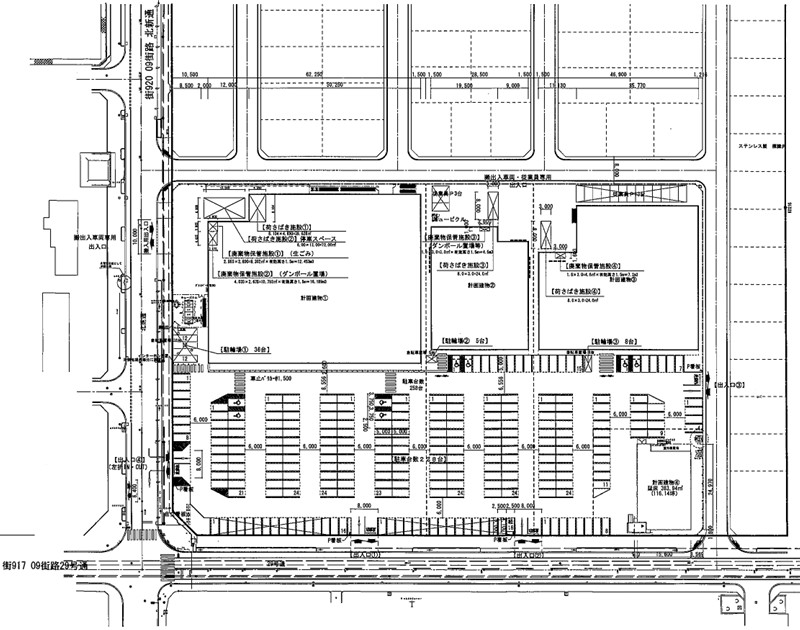 建物は3棟(計画建物1~3)で、各店舗面積は、イオン北海道が2099.767m2、大創産業が906.3m2、エコノス1485.809m2の計画。