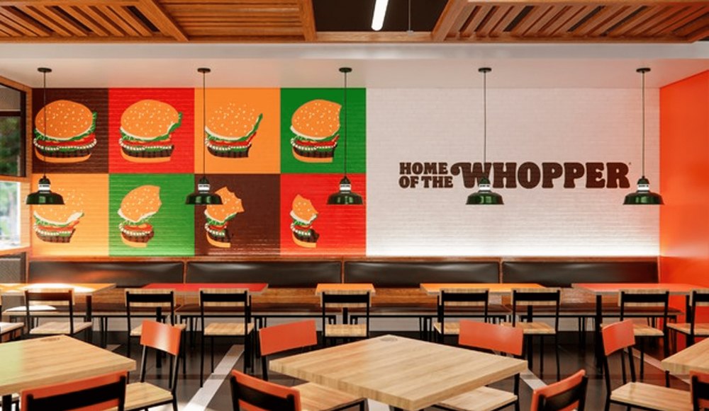 新店舗のデザインはバーガーキングのブランドカラーを基調とし、直火焼きのビーフパティや新鮮な野菜をイメージした色を使用した。