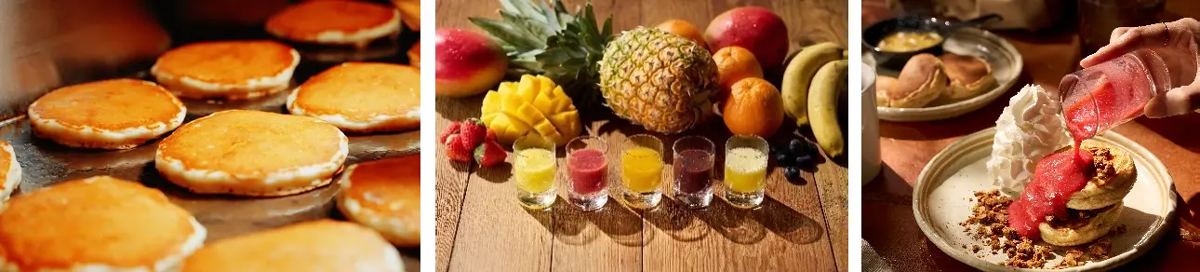 店内には「パンケーキバー」を設け、目の前で一枚一枚丁寧に焼き上げる。鉄板の上で生地がふわっとふくらみ、焼き色がついていく音、香ばしい香りが広がるライブ感と、できたてのパンケーキが味わえる。