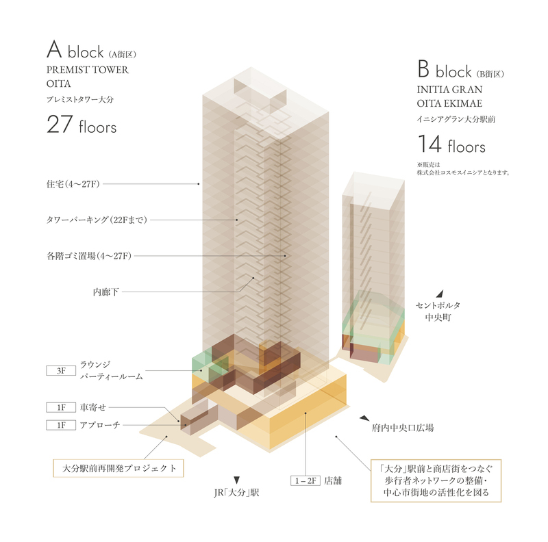 「プレミストタワー大分」は、大分県大分市末広町一丁目地区における再開発事業「大分駅前再開発プロジェクト」の区域内で進められている地上27階建てのタワーマンションで、高さ約98メートルは大分県内で最高層となる。