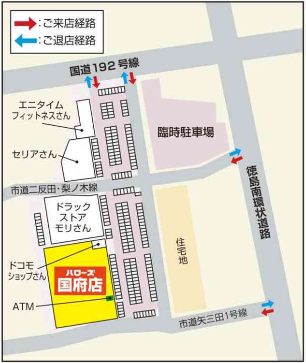24時間営業の食品スーパーで、隣接してSeriaハローズ国府モール店(2026年3月3日オープン予定)、エニタイムフィットネス徳島国府店(2026年3月5日(木)11:00オープン予定)、セブンATMハローズ国府店、ドラッグストアが協同出店する。