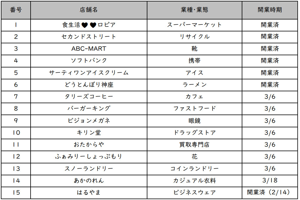 先行してスーパーマーケットの「ロピア」のほか、「セカンドストリート」「ABC-MART」「サーティワンアイスクリーム」など6店舗が開業済みで、2月14日にはビジネスウェア専門店「はるやま」も敷地内移転して先行オープンしている。