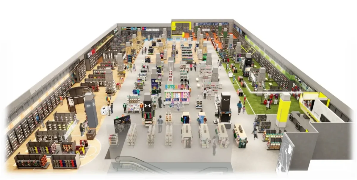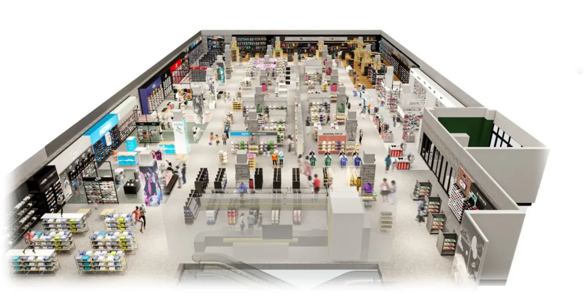 各所に大型LEDビジョンを設置し、ダイナミックな映像演出と売場演出によって、まるでスタジアムやフィールドにいるような没入感を演出。商品を選ぶプロセスそのものを楽しめる新たな感動拠点を目指す。