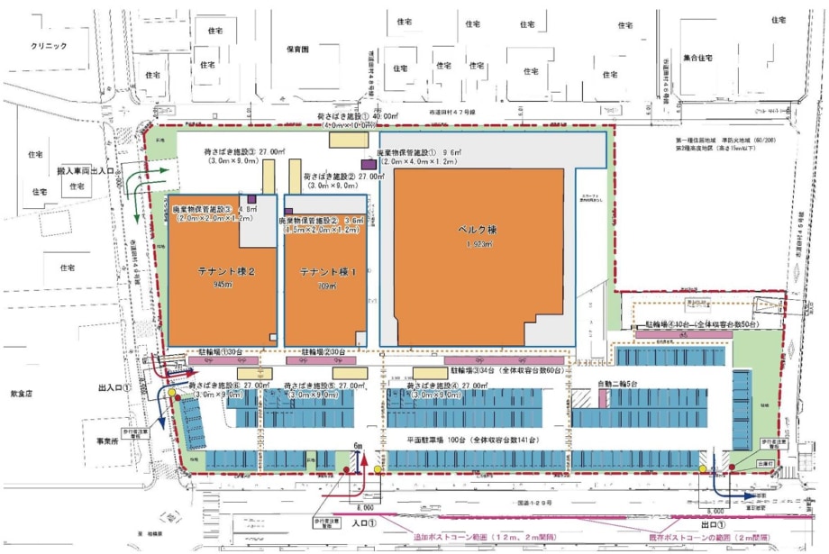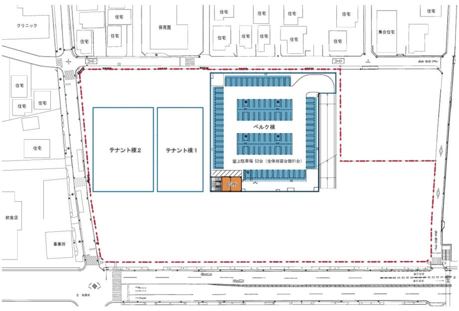 建物は3棟で、ベルク棟(店舗面積1階1923m2、2階65m2)、テナント棟1(店舗面積709m2)、テナント棟2(店舗面積945m2)の計画。