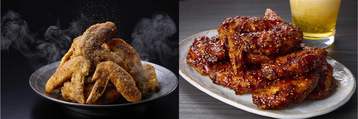 家庭では手間のかかる手羽先の唐揚げを、ホワイトペッパーと花椒(ホアジャオ)をブレンドし、痺(しび)れる辛さの「秘伝のスパイス味」、コショウが強めで甘い・辛いが両方楽しめる「魅惑の甘辛ダレ味」の2種を展開。1本85円で提供する。