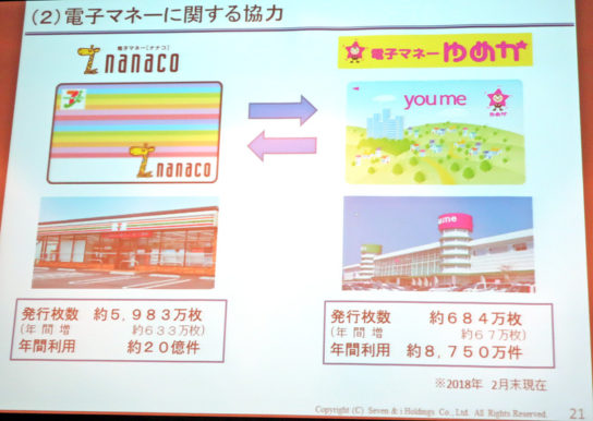 セブン&アイグループとの提携として、電子マネーでも協力を進める。セブン&アイの電子マネーナナコと、イズミの電子マネーゆめかの相互利用をすすめ、お客の利便性を高める。