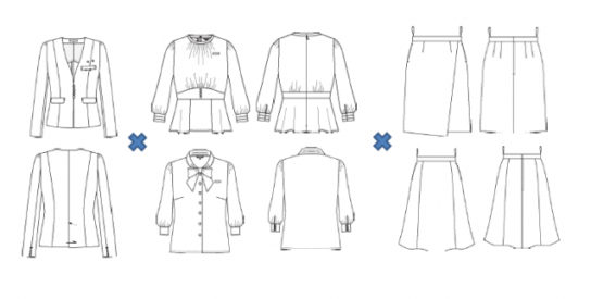 ブラウスはタックとボウタイ、スカートはフレアとタイトのそれぞれ2種類、スタッフが好きな組み合わせを選ぶことができる。
