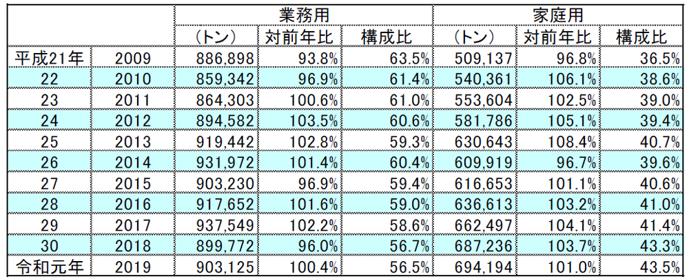家庭用は数量が69万4000トン(1.0%増)となり、5年連続で増加、金額は3161億円(1.0%減)となり、わずかながら減少となった。