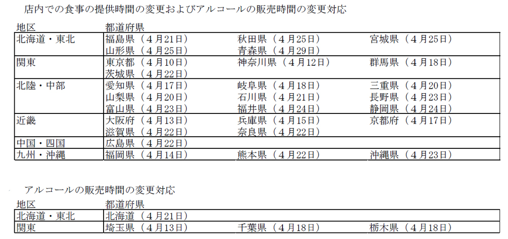 5月7日以降、東京都・神奈川県・大阪府・福岡県・兵庫県・愛知県・京都府・岐阜県・群馬県・石川県・広島県・熊本県・茨城県・福島県・長野県・奈良県・滋賀県・富山県・沖縄県・福井県・山形県・静岡県において、20時で店内のみ閉店、20時~5時はテイクアウトのみの販売となる。