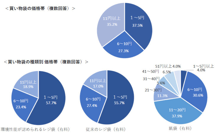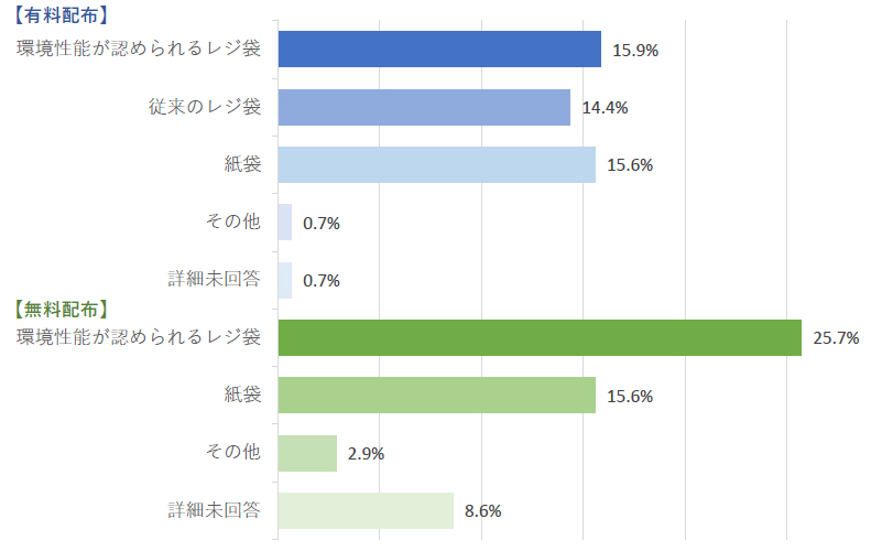 有料化している店舗が多い中、食べ歩きもできるような軽飲食を取り扱う店舗など一部の店舗(15.2%)では、環境性能が認められたレジ袋を無料配布していることも明らかになっている。
