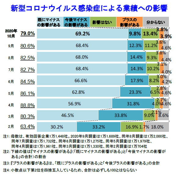 調査期間は2020年10月19日~31日、調査対象は全国2万3695社で、有効回答企業数は1万1448社(回答率48.3%)。新型コロナウイルス感染症に関する調査は、2020年2月から毎月実施し、今回で9回目となった。