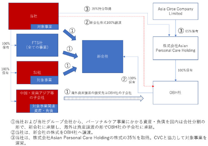 同社は対象事業のさらなる成長に向けた独立を支援するために、OBHの完全親会社であるAsian Personal Care Holdingの株式の35%を取得して合弁事業化し、CVCと協力して同事業を運営していく。