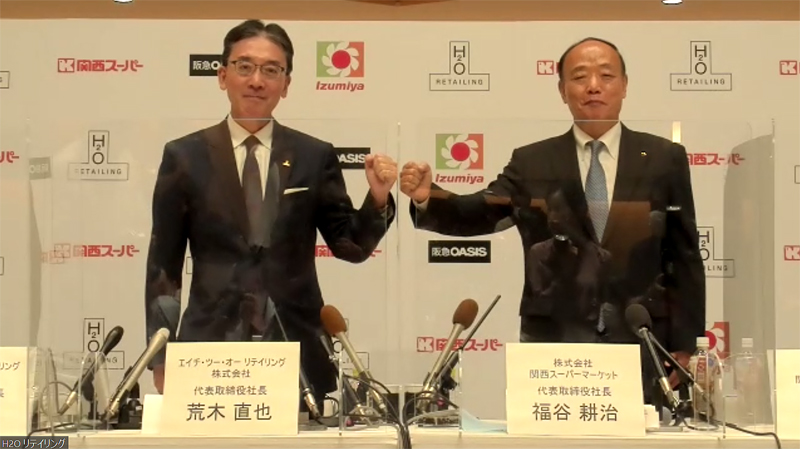 同日、開催した記者会見で、H2Oの荒木直也社長は、「中計で掲げる関西ドミナント化戦略の一環で、万代との業務提携に続く施策。業態間競争や価格志向の高まりなど競争環境が激化する中で、経営統合によりコスト削減などのシナジーを見込んでいる。各ブランドを生かした特色と地域密着を生かし、万代との提携を含め、関西最強のスーパーマーケット連合を目指す」と述べた。