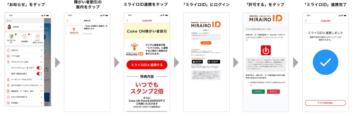 また、アクセシビリティ改善の取り組みの一環として、ミライロが提供するデジタル障がい者手帳「ミライロID」との連携を4月8日に開始。アプリから「ミライロID」の認証を行うことで「Coke ON 障がい者割引」の対象となる。