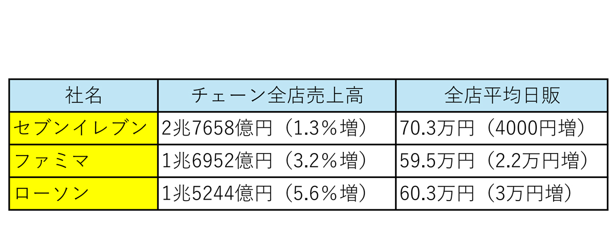 ファミリーマートは、営業収益2605億4900万円(1.2%増)、事業利益616億6400万円(19.1%増)、チェーン全店売上高1兆6952億8600万円(3.2%増)。全店平均日販は、過去最高の59万5000円(2万2000円増)となった。