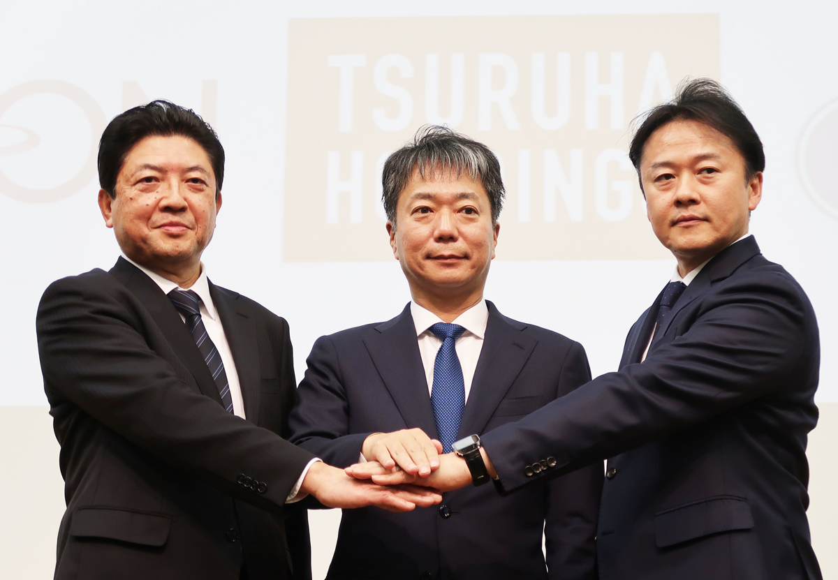 ※左からイオン吉田社長、ツルハHD鶴羽社長、ウエルシアHD桐澤社長