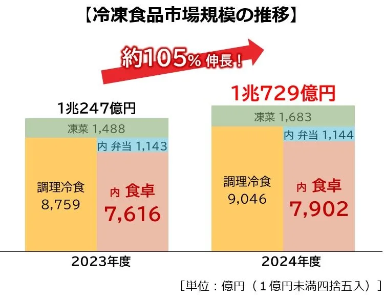 味の素冷凍食品の調査によると、冷凍食品の2024年度の市場規模は1兆729億円で、前年度比5%増だった。市場規模は右肩上がりに推移している。